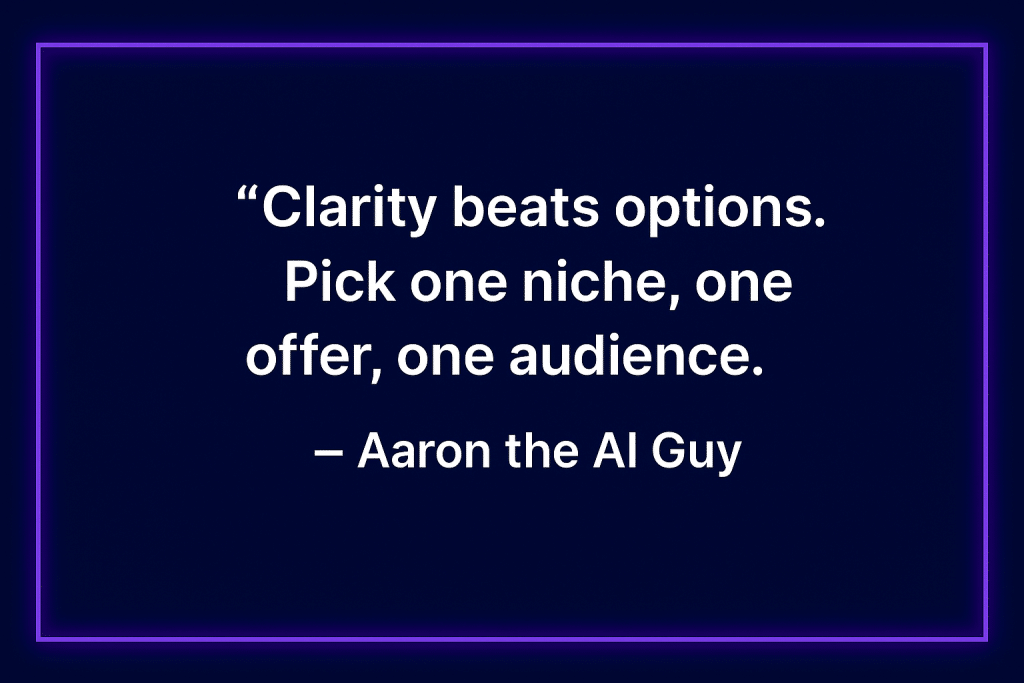 3. Find the quiet ponds. Use AI to surface known but under-served sub-niches (e.g., “AI productivity coaching,” “eco family budgeting”). Enter early.